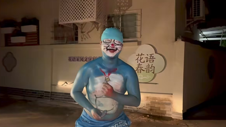 更离谱的是激情:为了追求 “亮眼”,他把脸和身体涂成了荧光蓝,在镜头下泛着刺主见光,扫数莫得哆啦 A 梦的轻柔感;脸上的眼睛是用马克笔径直画的,歪七扭八像两条线,铃铛亦然塑料玩物串在绳索上,一步辇儿就叮作为响,却莫得半点可儿,反而透着低价感。
