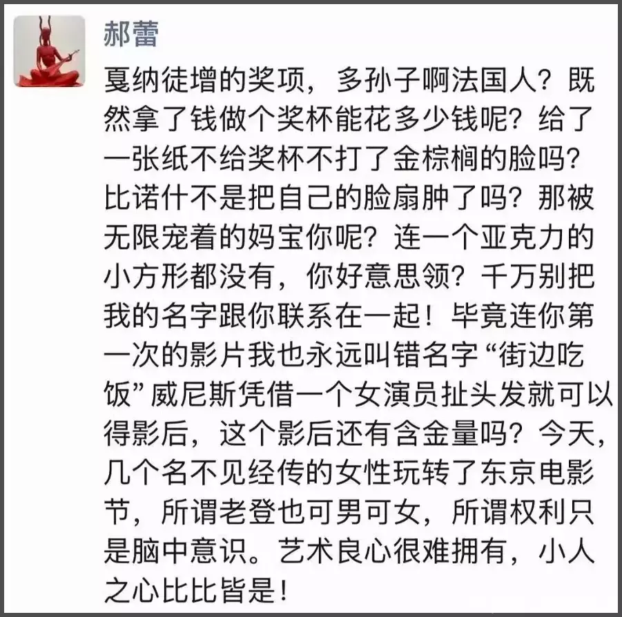 还铭刻辛芷蕾拿了威尼斯影后之后,郝蕾发一又友圈骂了泰半个电影圈,亦然和《散失的我》的编剧爆料的戛纳齐能买奖对上了。