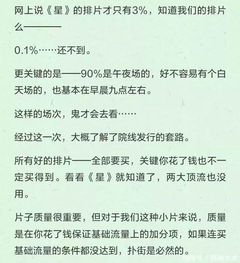 创作的电影第一次上院线就喜提扑街,《散失的我》编剧亦然躺平了,爆起料来目无尊长的,径直就示意院线排片齐有套路,好的排片一齐要买,要津是未必辰用钱也买不到,就像《银河入梦》,找了流量加合手也莫得效。