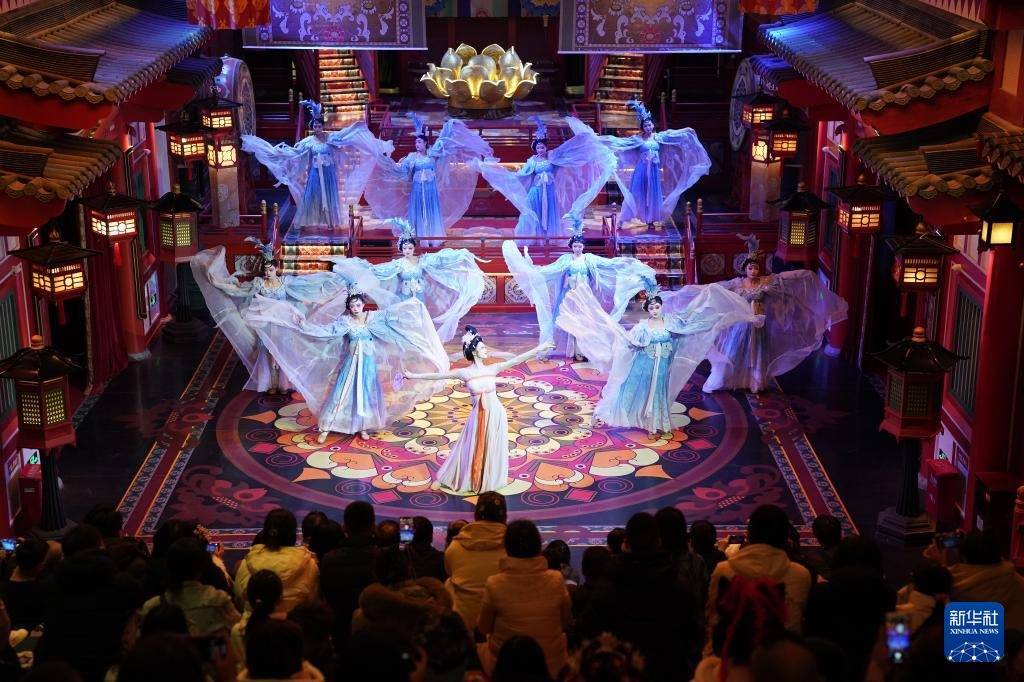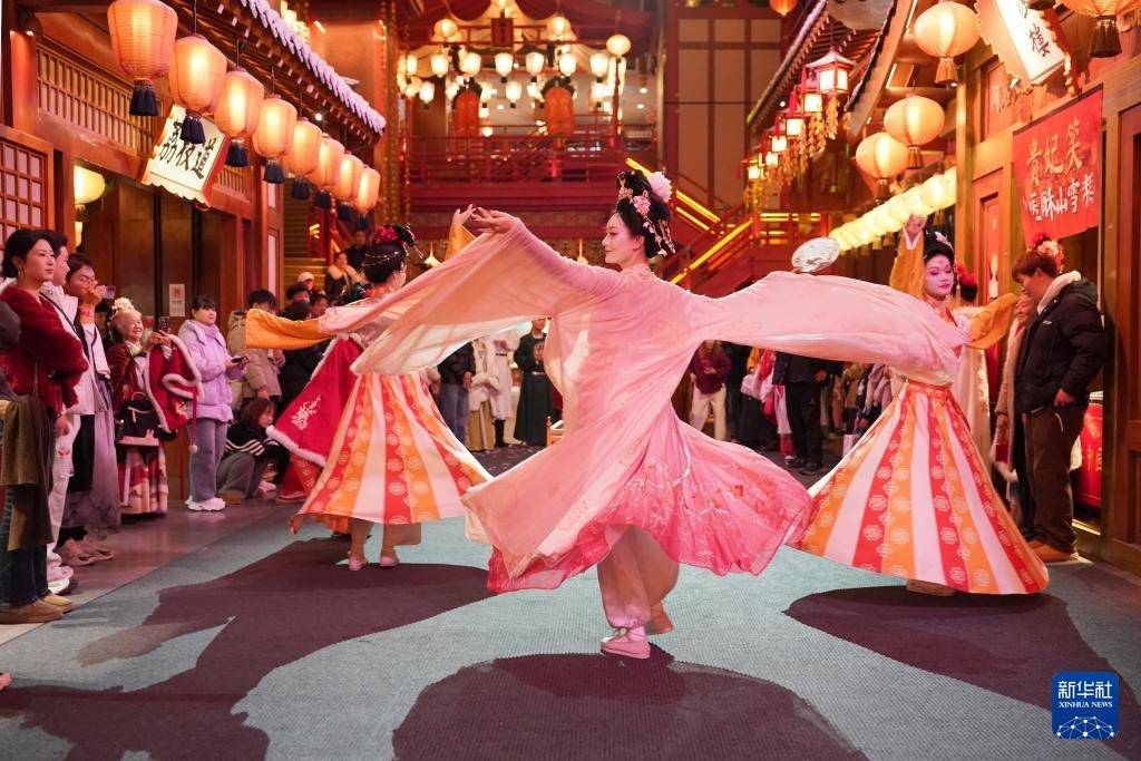 12月23日,演员在街区内演出大唐乐舞《霓裳羽衣舞》。