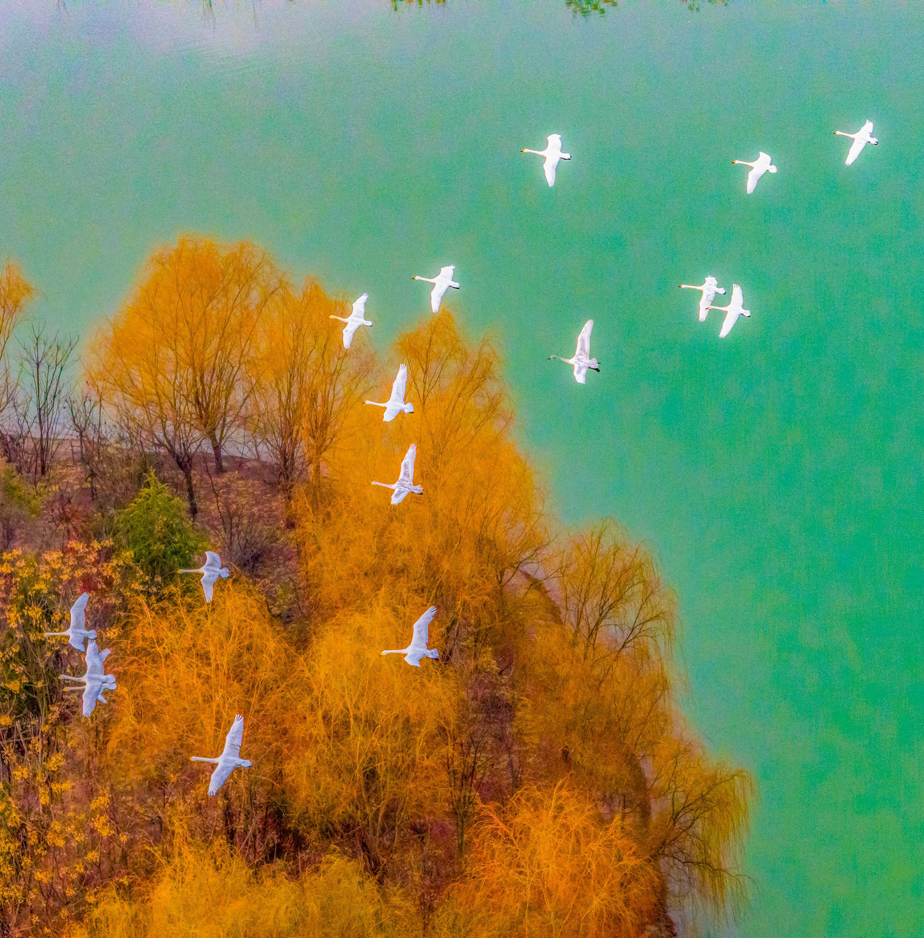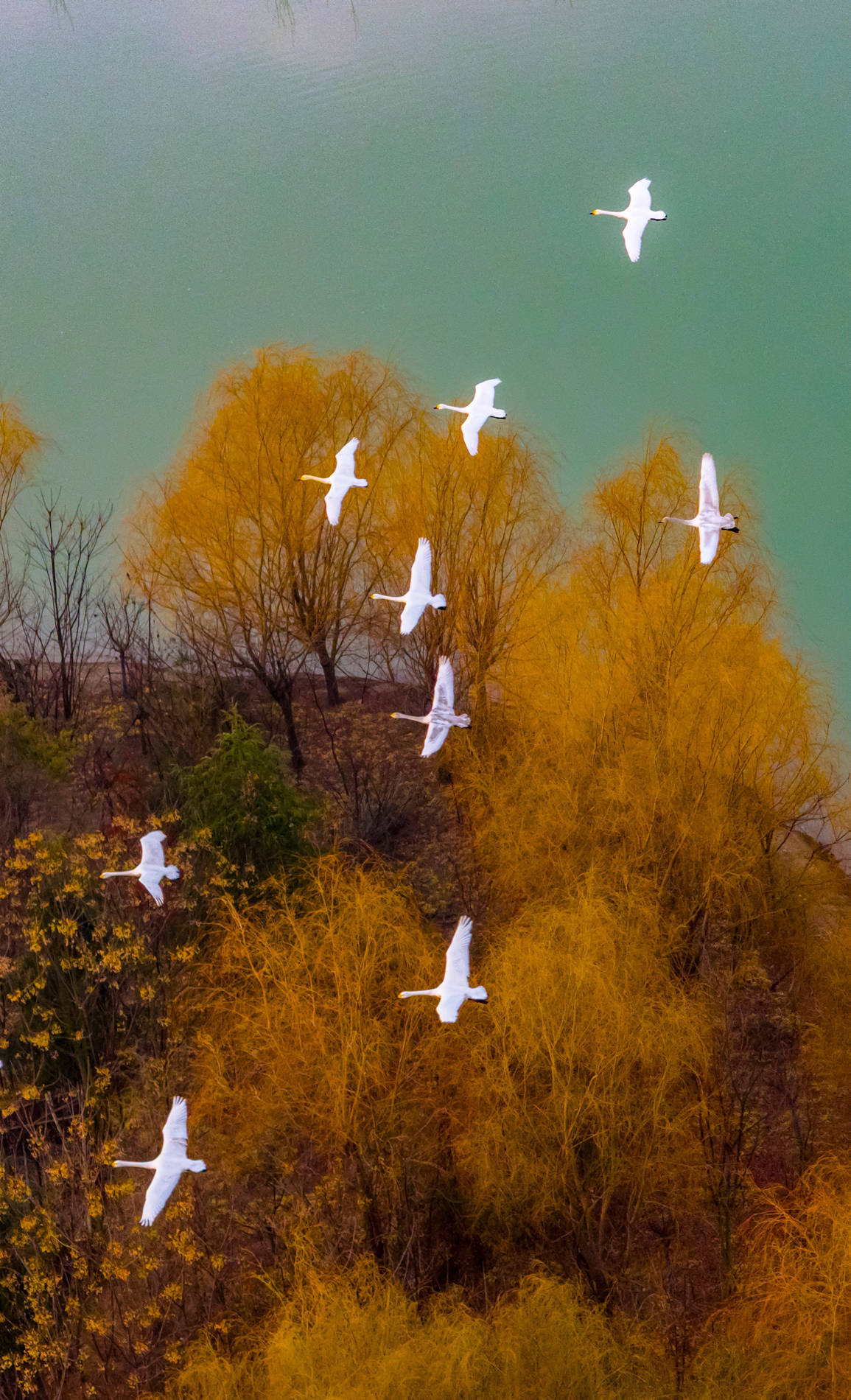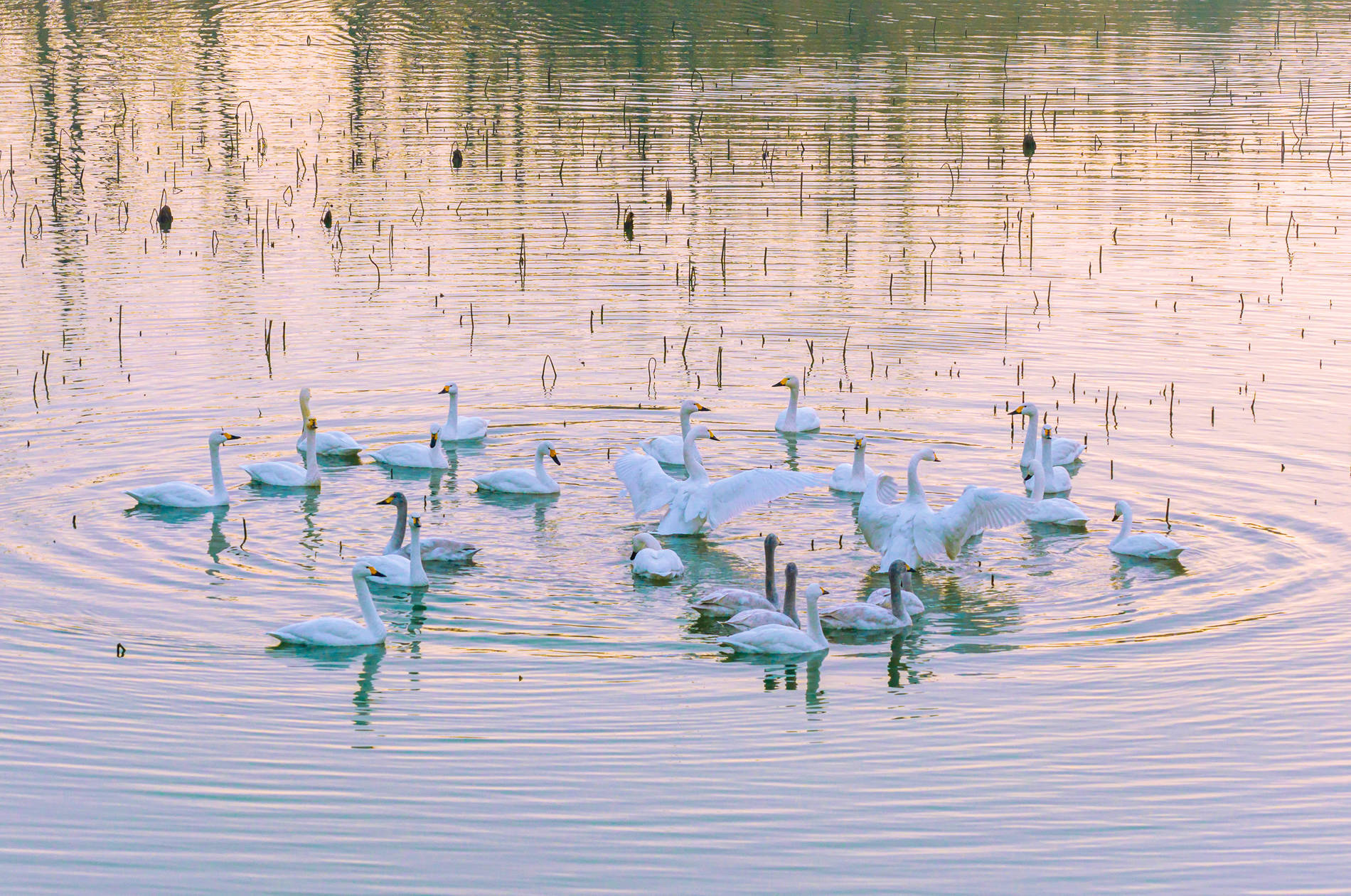 ↑2026年1月14日在江苏省泗洪县洪泽湖湿地景区临淮段拍摄的小天鹅。(无东说念主机相片)CICPHOTO/张连华 摄
