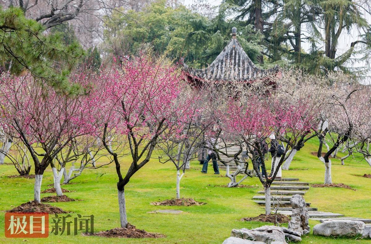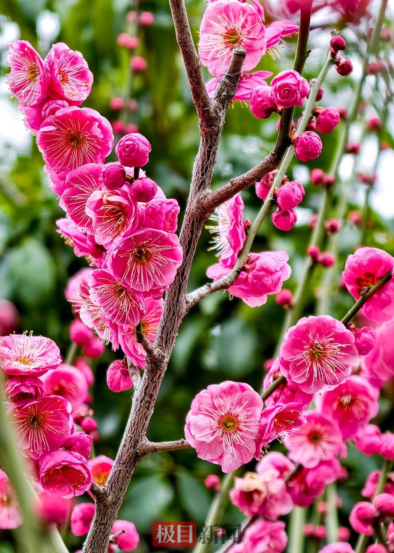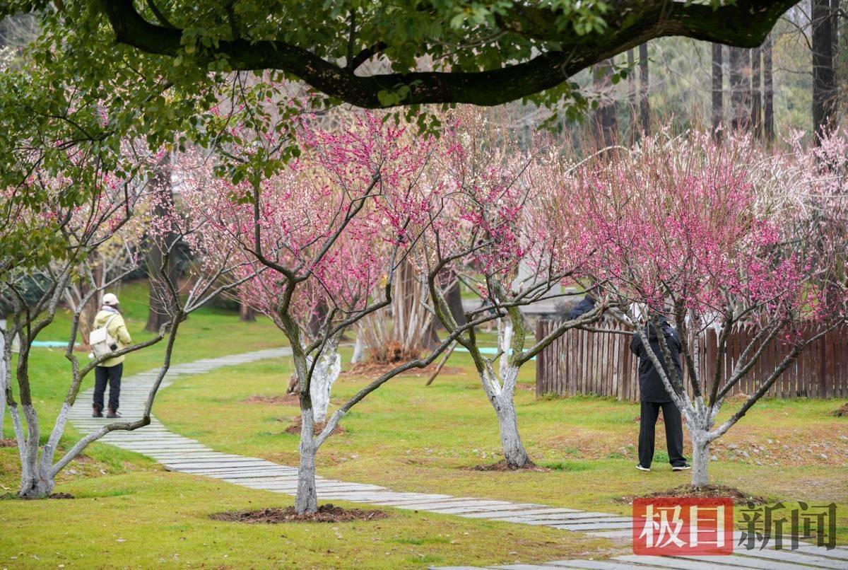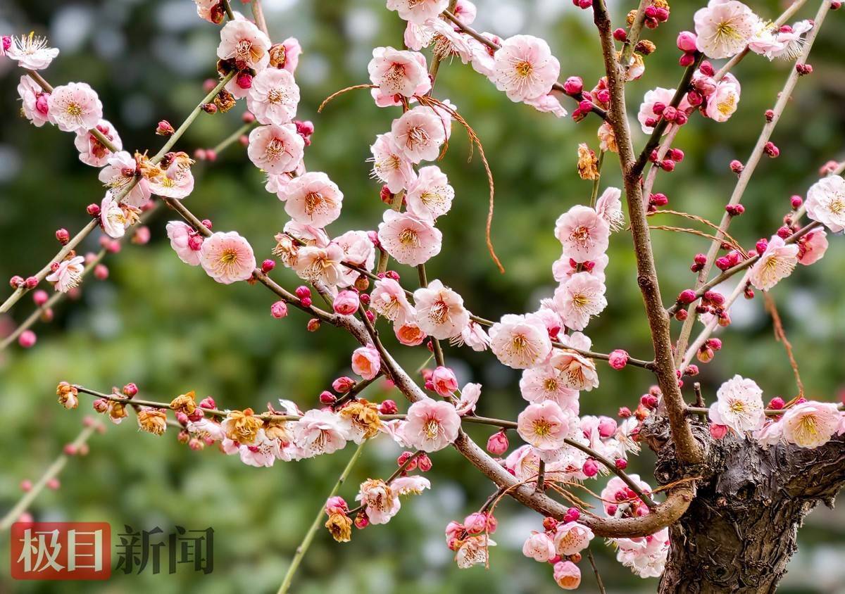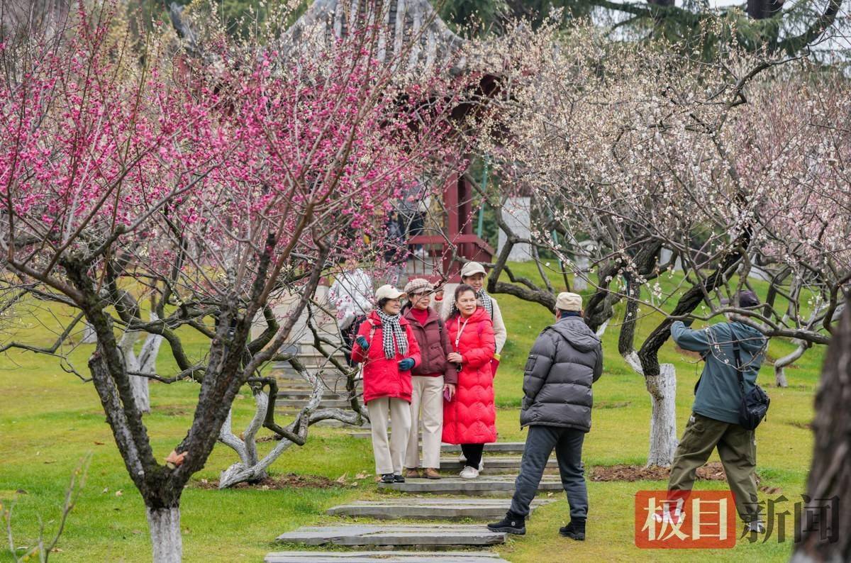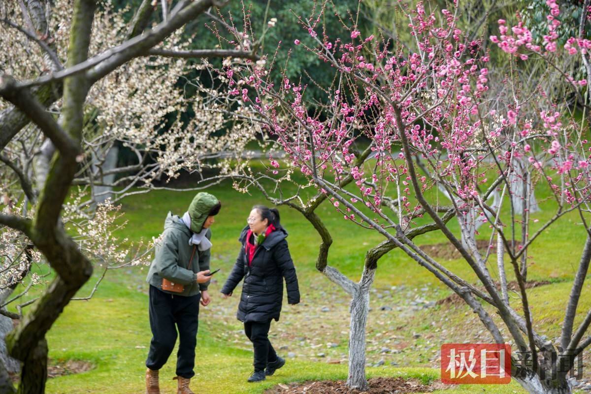 本日上昼,极目新闻记者现场看到,坡地上被各色梅花装点得灿若烟霞。绿萼梅缀着剔透水珠,素白花瓣透着高雅暗香;铁梗红枝干强盛,艳红花朵强烈奔放;粉黛阁重重叠叠,嫩粉花瓣如仙女含羞;送春梅振奋枝端,半粉半白的花姿别具韵味。雨后初晴的阳光洒在花枝间,光影斑驳,梅香在崭新空气中愈发清冽。市民旅客或举入辖下手机定格花影,或携家东说念主在梅林间溜达,孩童追吐花香奔波,照相兴趣者架起树立捕捉光影下的梅韵。
