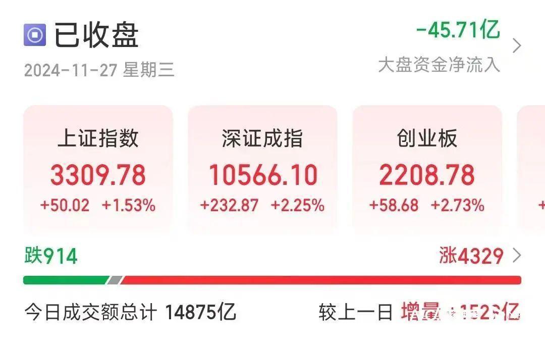 11月27日,三大指数集体收涨,沪指重返3300点。罢休收盘,沪指报3309.78,涨1.53%,深证成指报10566.10,涨2.25%,创业板指报2208.78,涨2.73%。全市成交额认为14875亿,较上一交游日放量1529亿,全市4329股上升。