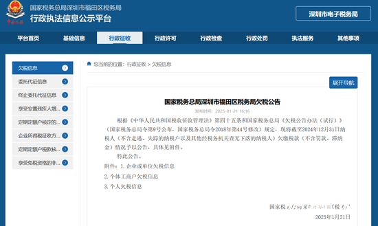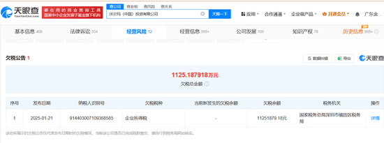 南王人湾财社记者查询天眼查发现,1月21日,沃尔玛(中国)投资有限公司新增一则欠税公告,欠税总金额1125万余元,欠税税种为企业所得税,税务机关为国度税务总局深圳市福田区税务局。此外,天眼查标注:“该场所展示的欠税公告仅代表发布日历时的欠税情况,面前该公司是否已完成税款缴交,请自行到税务局网站核实。”