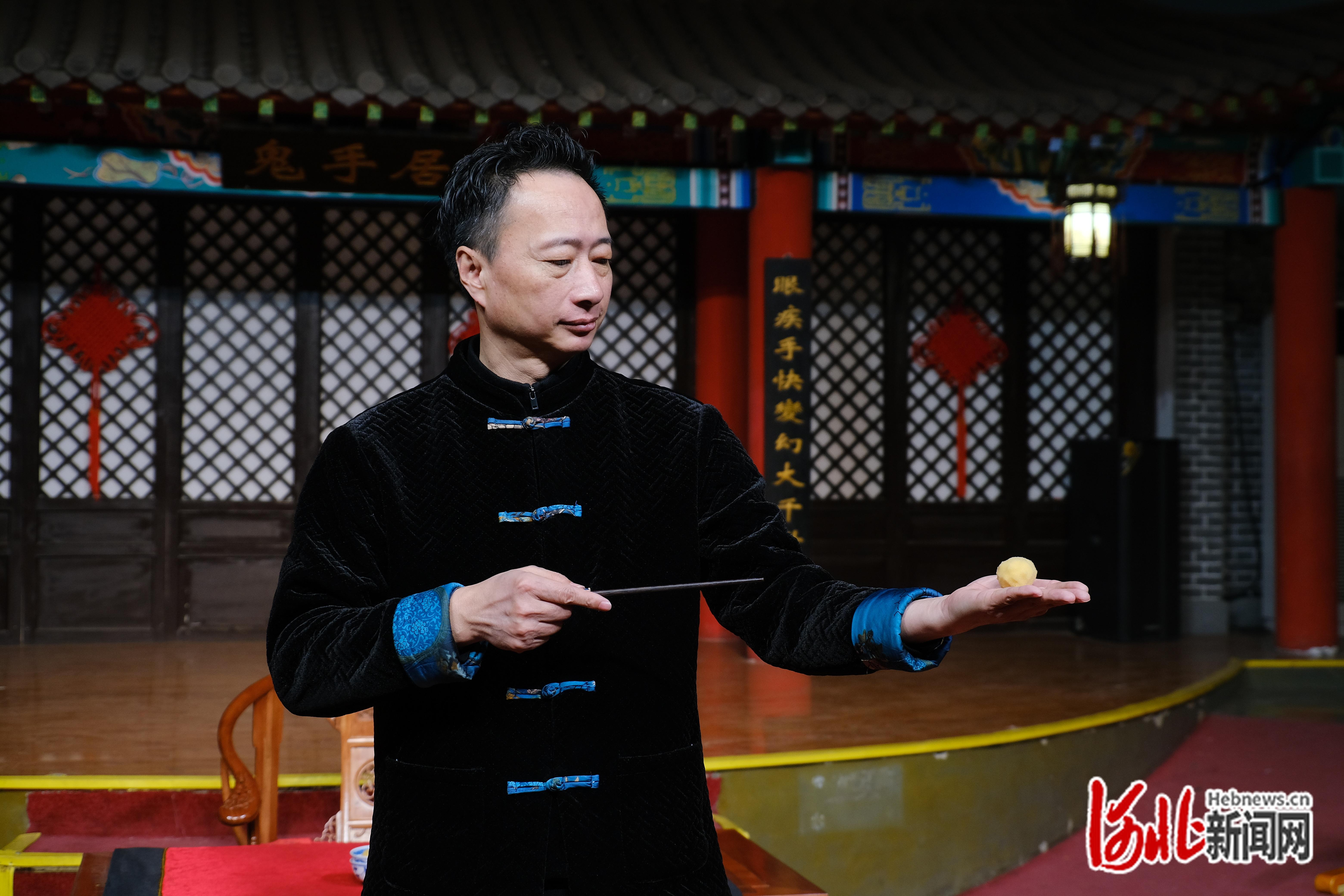 沧州市级非物资文化遗产吴桥杂技地摊魔术代表性传承东说念主王耀强。刘子恒摄