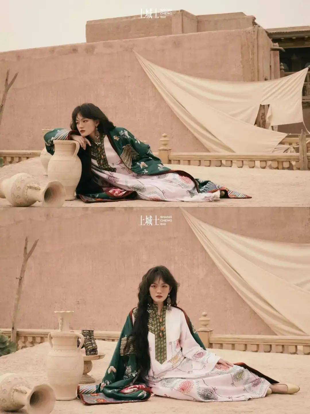 她还尝试了多种发型和头饰。偶而编着细辫,缀着银饰和绿松石;偶而戴着传统拈花帽,额前挂着精采银链。