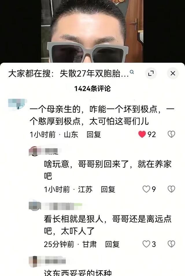 然而直到看到最近双胞胎弟弟的直播,对哥哥绝不饶恕的抨击和谩骂,才知谈当初父母被采访时说的那些话有多调侃,省略当初弟弟在镜头下的拥抱,也只是好逸恶劳。