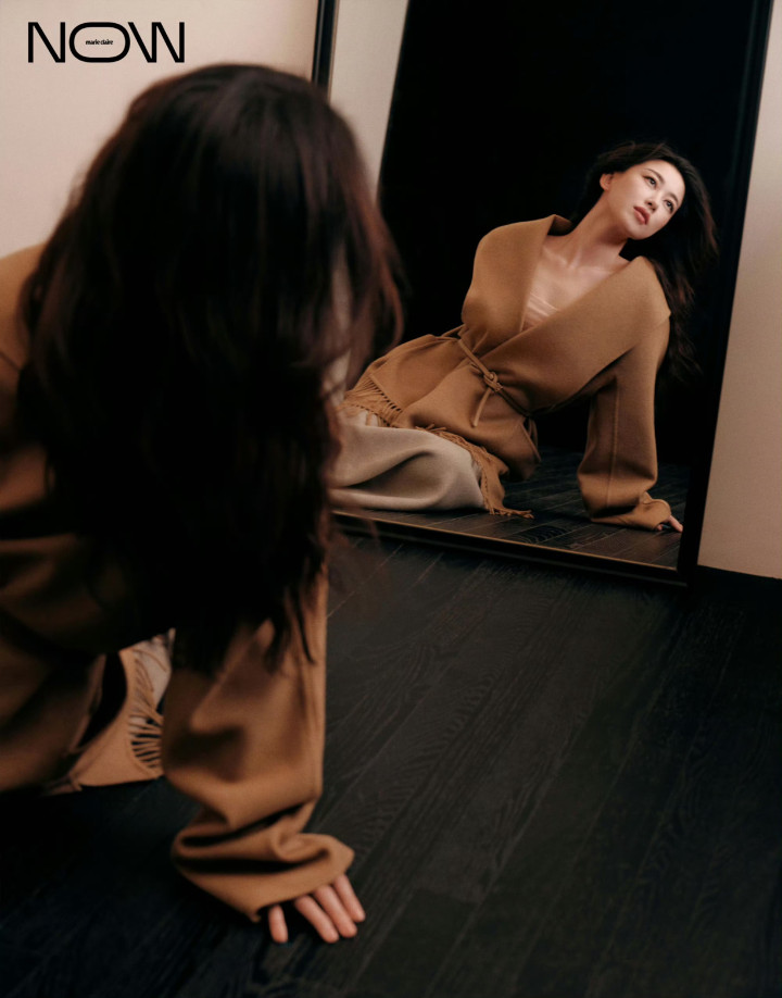 驼色流苏大衣搭配浅灰色长裙,朱珠手托面颊望向一侧,发丝轻扬间,大衣的垂坠质感与流苏的灵动神乎其神,暖融融的颜色层层晕开,交融出冬日里的柔软与高档,氛围感自然浑成。