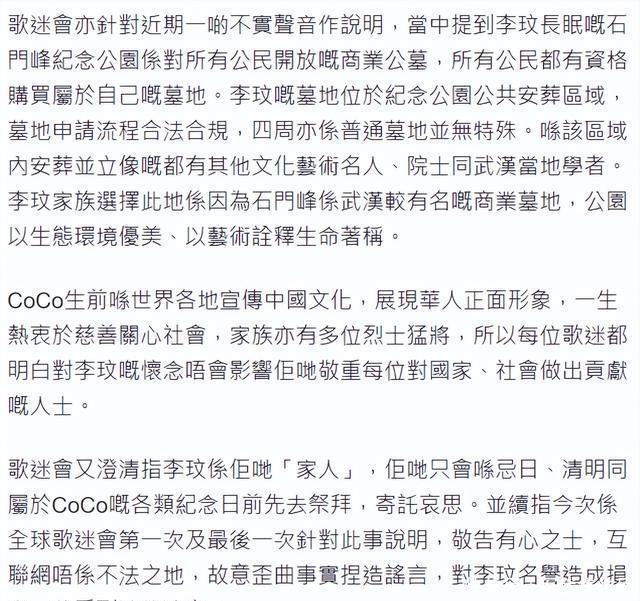 另外,李玟群众歌迷会发声明知晓,左证墓园漠视对坟场相近校阅,酿成当然的攻击区域,给死人欢欣的环境,同期默示李玟坟场苦求经由正当合规,四周并无异常,地点区域有其他的武汉名东谈主,露出歌迷会只在忌辰和晴明节去拜祭,针对网罗上的坏话,将以法律期间根究。