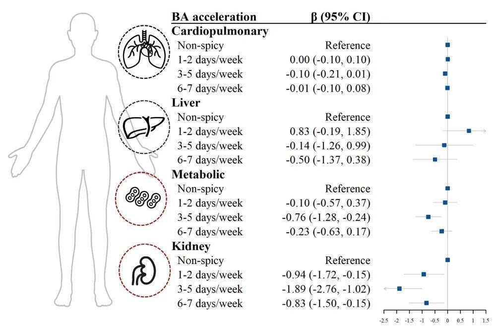 收尾十分耐东说念主寻味:与很少或不吃辣的东说念主比拟,每周吃辣 3–5 次的东说念主,概述生物学年级的加快值下落约 0.69 岁;每周 6–7 次的降幅约 0.32 岁,1–2 次下落不权贵[1]。分系统看,上风更聚积在代谢和肾脏:每周 3–5 次与更慢的代谢系统老化(-0.76 岁)和肾脏老化(-1.89 岁)关系,而心肺与肝脏的相反较小或不踏实。