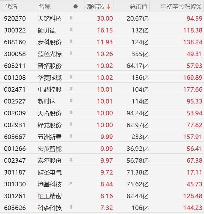 12月30日,A股阛阓机器东谈主主意股全线高涨,其中,天铭科技30CM涨停,硕贝德涨超16%,步科股份涨近12%,蓝色光标涨超10%,晋拓股份、华菱线缆、中超控股、新时达、天奇股份、锋龙股份、五洲新春、宏英智能、泰尔股份10CM涨停。